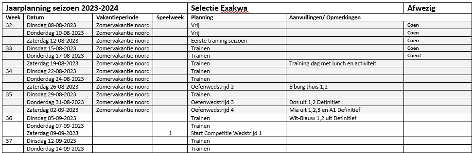 Ik wil graag dat jullie voor die tijd een A4 bij mij aanleveren met een foto van jezelf, naam, hoeveel jaar je in de selectie speelt en wat je sterke en verbeterpunten zijn t.a.v. korfbal. Coen kan dan in de vakantie alles doorlezen en jullie op papier al leren kennen.