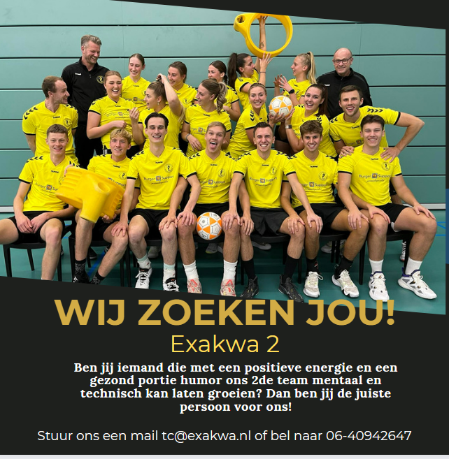 Wie zoeken wij: Exakwa 2 is op zoek naar een trainer/coach die enthousiast en ambitieus is, die de spelersgroep verder kan brengen, zowel individueel als als team. Je weet een perfecte balans te vinden in het uitdagend maken van de trainingen, waar de spelers met veel plezier aan willen deelnemen. Daarnaast ben je een sparringpartner voor de hoofdtrainer Coen Klappe. Iemand die beschikbaar is voor trainingen op de dinsdag en donderdagavond.