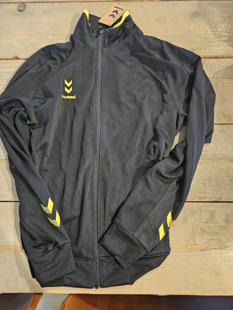 - Trainingsjasje zwart met geel: €7,50 (maten 128, 152, 164 2x, HS, HM en HL)